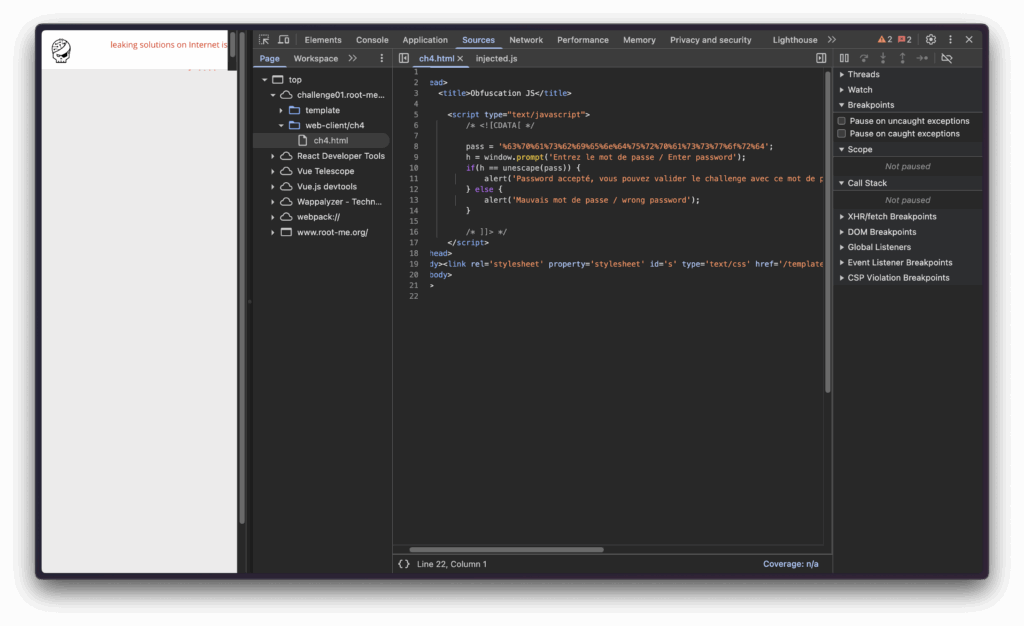 on réactive les habitudes des challenges précédents : cancel, inspecter l’élément, source et fouiller dans le script !