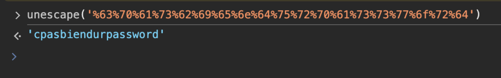 Qu’est ce que unescape ? Une fonction (plus trop maintenue) qui sert à traiter du texte hexadécimal pour le remplacer par du texte intelligible. Nous allons tester cela, rendez-vous dans la Console cette fois-ci, où nous pouvons utiliser des fonctions javascript de toute sorte et voir le résultat.