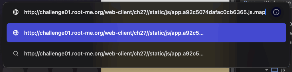 Ici le sourceMappingURL est en clair, nous pouvons donc nous baser sur ce nom de fichier et sur l’emplacement des autres fichiers js (/static/js/) pour télécharger le fichier :